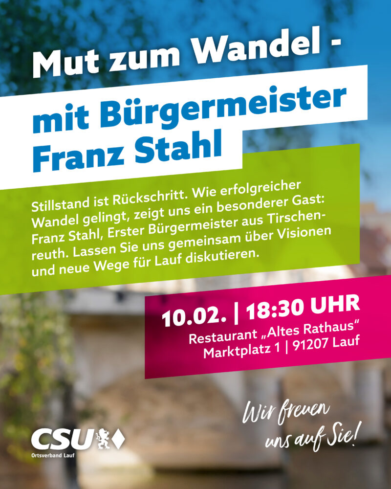 Lauf – Der CSU Ortsverband Lauf lädt am 10. Februar 2026 um 18:30 Uhr ins Alte Rathaus Lauf (Marktplatz 1) ein. Unter dem Motto „Mut zum Wandel“ spricht der Erste Bürgermeister der Stadt Tirschenreuth (Partnerstadt von Lauf), Franz Stahl, über erfolgreiche kommunale Entwicklung und nachhaltigen Wandel.
