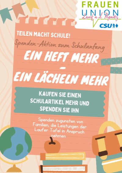 Wir rufen daher mit der CSU und Frauen-Union Lauf zu einer Spenden-Aktion für den schulischen Bedarf auf. Eine ähnliche Spenden Aktion hat unsere Junge Union bereits in Kooperation mit dem Laufer Edeka-Markt und der Tafel Lauf durchgeführt. Hier ging es um Lebensmittelspenden. Jetzt rufen wir zur Spende von Schulartikeln auf.