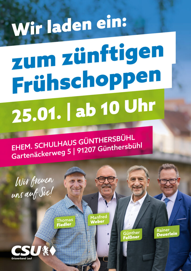 Am Sonntag, 25. Januar 2026, laden die Stadträte Günther Felßner, Manfred Weber und Rainer Deuerlein herzlich zum traditionellen Weißwurstfrühschoppen ein. Die Veranstaltung beginnt um 10:00 Uhr im alten Schulhaus in Günthersbühl.